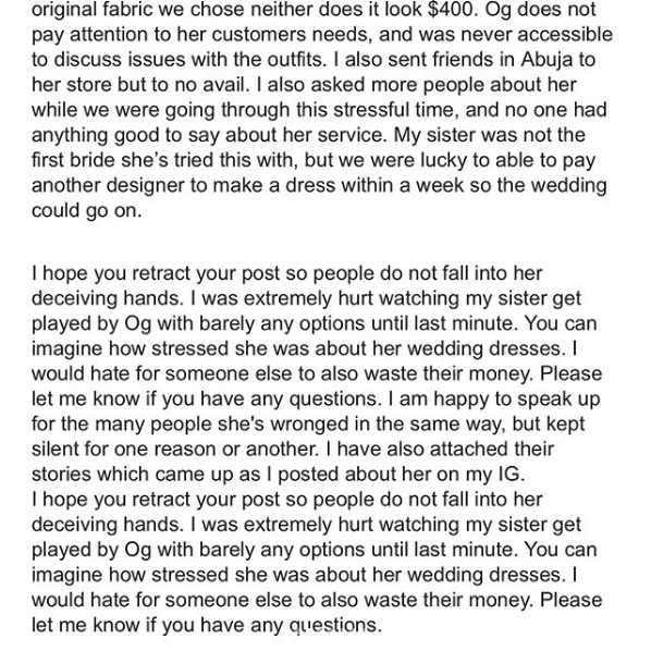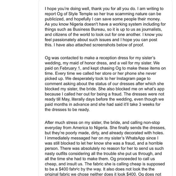 Style temple recently was in the news as a bride called her out for a case of what I ordered versus what i got, there were mixed reactions on the gram, but these are  screenshots of a mail sent out by the Bride’s Sister.