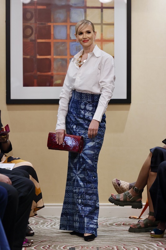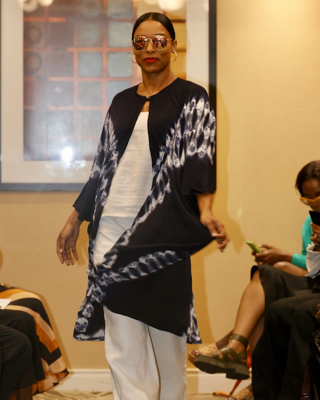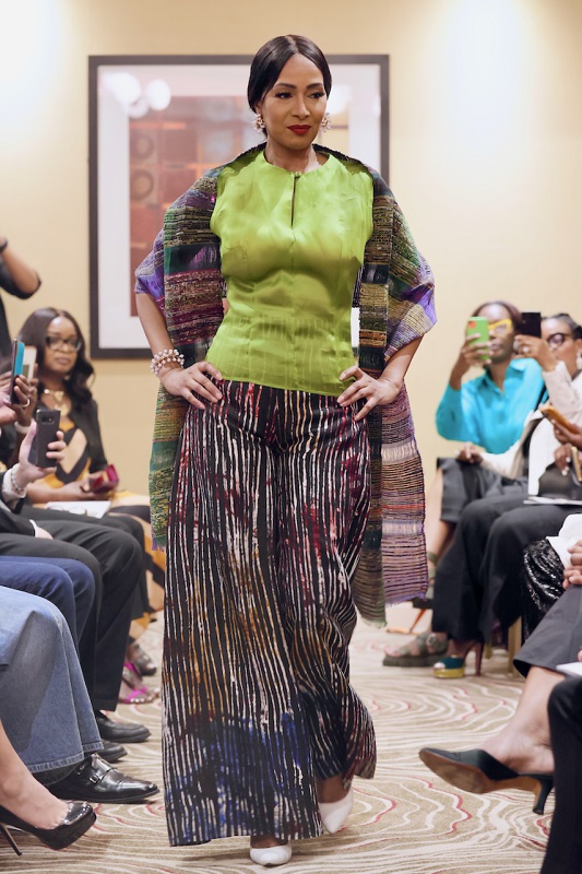 Beautiful skirts with the Arewa motif embroidered by hand by weavers from the northern part of Nigeria ,coats made from Ghanaian crack adire, vintage Asò oke capes( very sustainable) jackets and palazzo trousers made from Ade Bakare’s signature adire patterns such as Ila (lines Ilaari (comb) coaoa and Ododo (flowers ) where all on display . Due to the success of the show ,the BBC invited ade Bakare to an interview at the west end headquarters in london ,where he was interviewed and the tv presenters modelled his collection to be shown on the BBC channels across the world