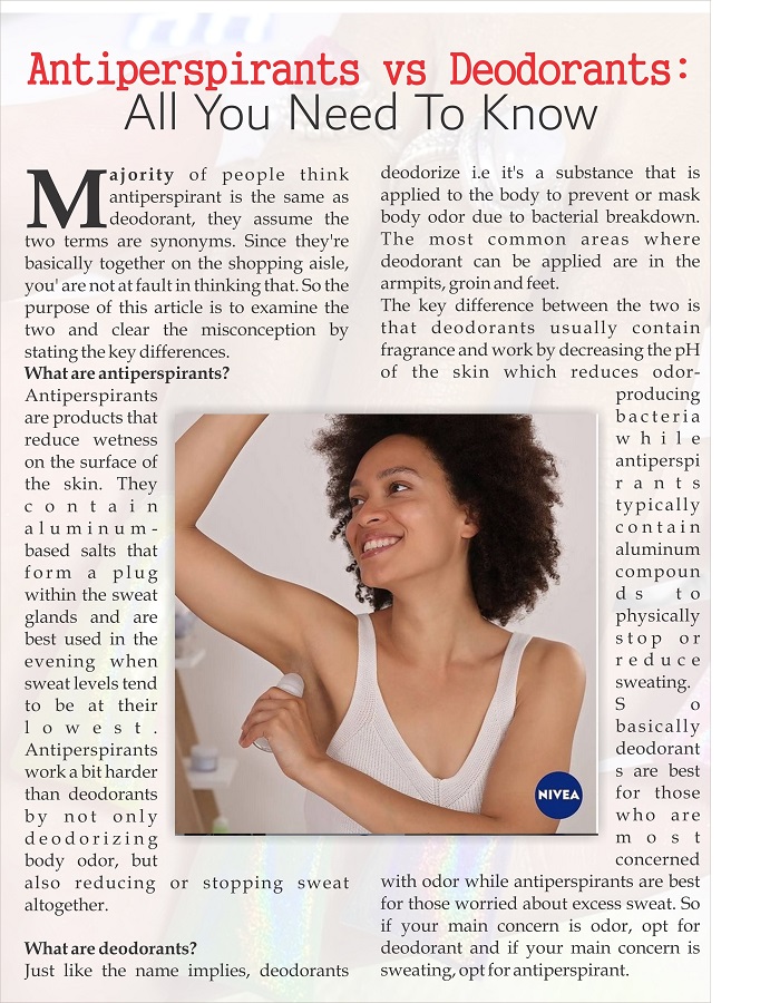 Majority of people think antiperspirant is the same as deodorant, they assume the two terms are synonyms. Since they’re basically together on the shopping aisle, you’ are not at fault in thinking that. So the purpose of this article is to examine the two and clear the misconception by stating the key differences.