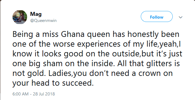 Being a miss Ghana queen has honestly been one of the worst experiences of my life, yeah, I know it looks good on the outside, but it’s just one big sham on the inside. All that glitters is not gold. Ladies, you don’t need a crown on your head to succeed.
