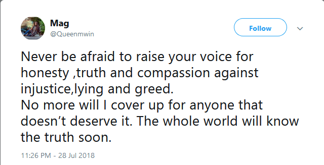 Never be afraid to raise your voice for honesty, truth and compassion against injustice, lying and greed. No more will I cover up for anyone that doesn’t deserve it. The whole world will know the truth soon.