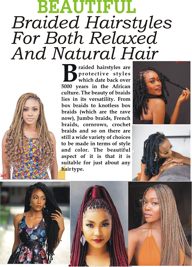Braided hairstyles are protective styles which date back over 5000 years in the African culture . The beauty of braids lies in its versatility. From box braids to knotless box braids (which are the rave now), Jumbo braids, French braids, cornrows, crochet braids and so on there are still a wide variety of choices to be made in terms of style and color. The beautiful aspect of it is that it is suitable for just about any hair type.