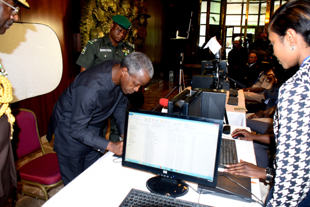 Buhari and vice president Yemi Osinbajo underwent their biometrics capturing by the Nigeria Immigration Service (NIS) and were presented with their diplomatic passports by the Minister of Interior, Abdulrahman Dambazau, and the Comptroller General of NIS, Mohammed Babandede.