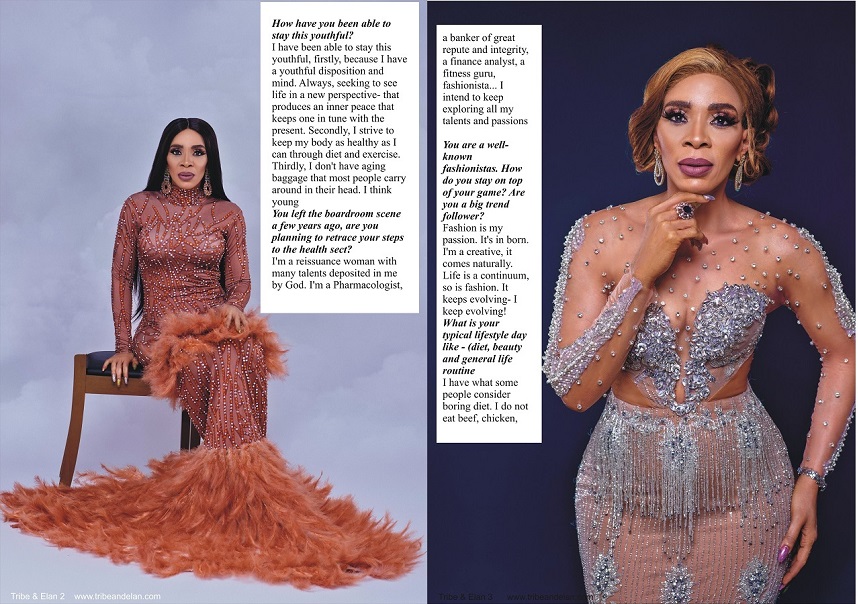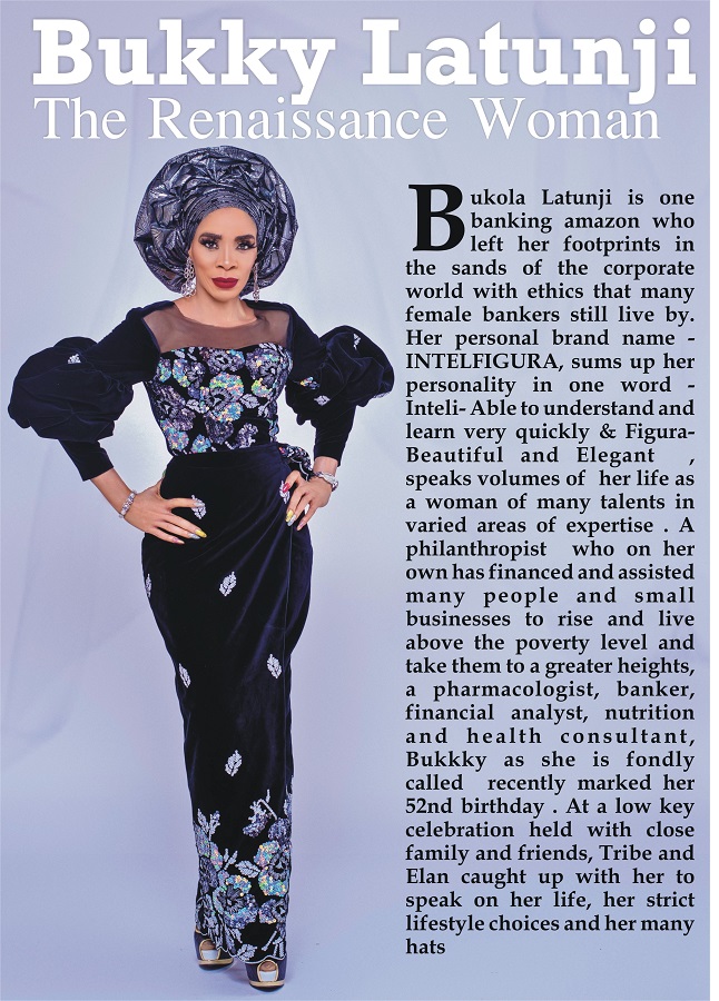 Bukola Latunji is one banking amazon who left her footprints in the sands of the corporate world with ethics that many female bankers still live by. Her personal brand name –INTELFIGURA, sums up her personality in one word – Inteli– Able to understand and learn very quickly & Figura– Beautiful and Elegant , speaks volumes of her life as a woman of many talents in varied areas of expertise . A philanthropist – who on her own has financed and assisted many people and small businesses to rise and live above the poverty level and take them to a greater heights, a pharmacologist, banker, financial analyst, nutrition and health consultant, Bukkky as she is fondly called recently marked her 52nd birthday . At a low key celebration held with close family and friends , Tribe and Elan caught up with her to speak on her life , her strict lifestyle choices and her many hats .