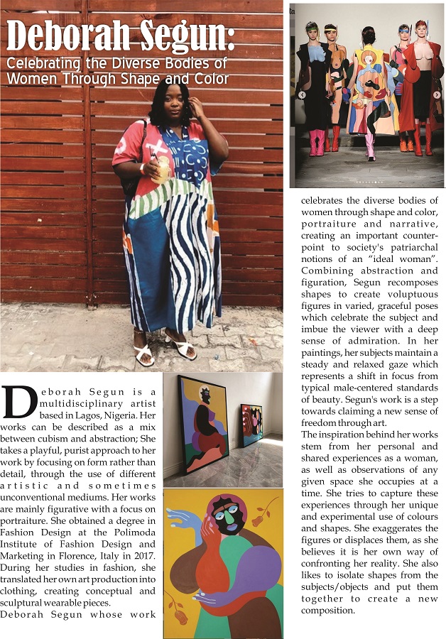 Deborah Segun is a multidisciplinary artist based in Lagos, Nigeria. Her works can be described as a mix between cubism and abstraction; She takes a playful, purist approach to her work by focusing on form rather than detail, through the use of different artistic and sometimes unconventional mediums. Her works are mainly figurative with a focus on portraiture. She obtained a degree in Fashion Design at the Polimoda Institute of Fashion Design and Marketing in Florence, Italy in 2017. During her studies in fashion, she translated her own art production into clothing, creating conceptual and sculptural wearable pieces.