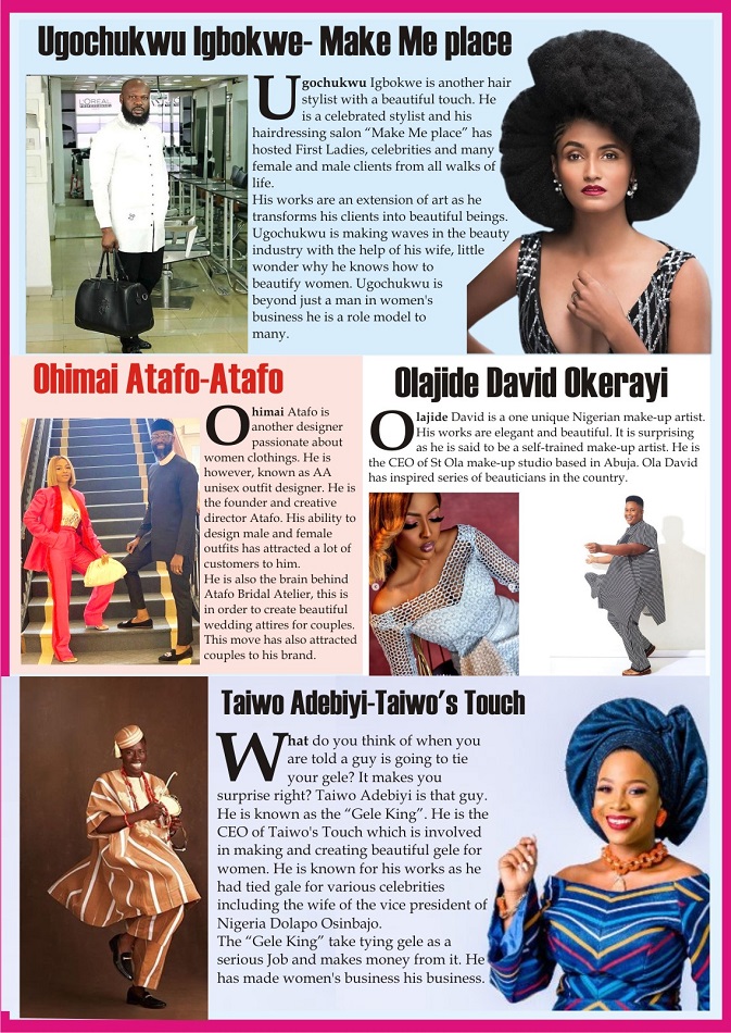 Over the years, various men have made a name for themselves by toeing the line of catering to women in a female dominated business. From hairstyling to makeup, some of these male owned businesses are being patronised by women who have more confidence in the men delivering satisfactorily on the job over patronising their fellow women .