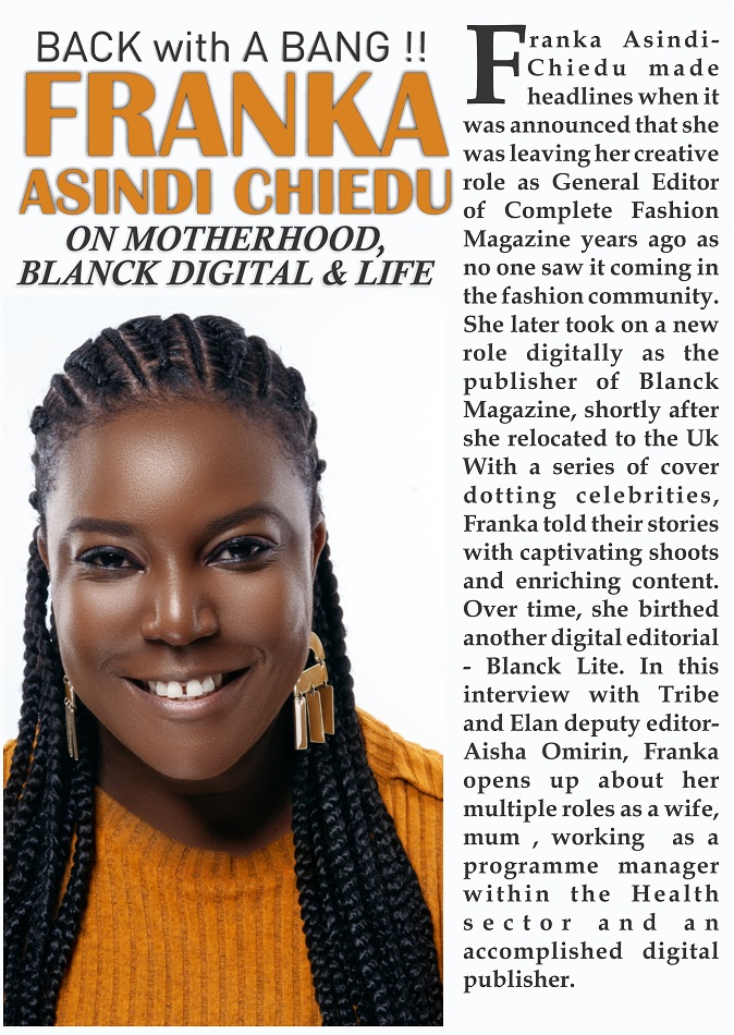 Franka Asindi-Chiedu made headlines when it was announced that she was leaving her creative role as General Editor of Complete Fashion Magazine years ago as no one saw it coming in the fashion community.She later took on a new role digitally as the publisher of Blanck Magazine, shortly after she relocated to the Uk With a series of cover dotting celebrities, Franka told their stories with captivating shoots and enriching content . Over time, she birthed another digital editorial – Blanck Lite. In this interview with Tribe and Elan deputy editor- Aisha Omirin , Franka opens up about her multiple roles as a wife , mum , working as a programme manager within the Health sector and an accomplished digital publisher.