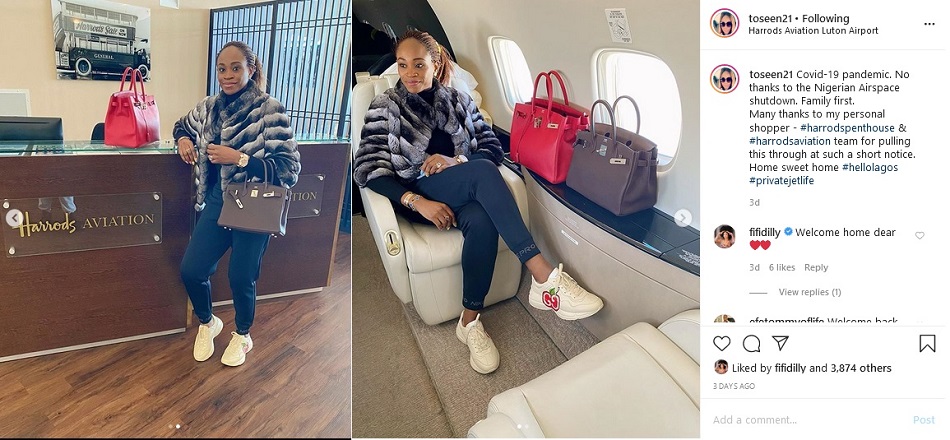 It all started when Tosin aka Toseen posted a picture of her in a private jet courtesy Harrods Aviation . While in the jet, Toseen in her usual manner had a spread of her two birkin bags amidst other luxury brands apparels she had on display saying …. Covid-19 pandemic. No thanks to the Nigerian Airspace shutdown. Family first. Many thanks to my personal shopper – #harrodspenthouse & #harrodsaviation team for pulling this through at such a short notice. Home sweet home