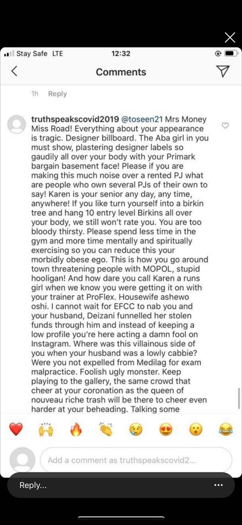 It was at this point Toseen came for her followed by a stream of her supporters in a trail of name calling and savage responses- It was messy . Toseen who is quite popular on the gram for flaunting luxury designer brands on social media , is the wife of billionaire business man – Taofik Adegbite, the Chief Executive Officer of Marine Platforms Limited. Apparently it seems that there is no love lost between these two as Toseen went on and on responding to various ill remarks hurled at Karen . Toseen finally ended it all by advising Karen ,saying … Karen, you need to look around you and sanitise your space before you advise me!! GET OFF MY BACK. Enough of this MADNESS! my page, my rules. I decide what stays!