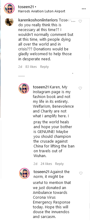 On the other hand , Karen who is the Owner of Award Winning Store Urban Living Lagos, Manufacturer of Bespoke furniture who did not find this amusing in any way commented , saying ……. Toseen, do you really think this is necessary at this time?? I wouldn’t normally comment but at this time, with people dying all over the world and in crisis??? Donations would be gladly welcomed to help those in desperate need.