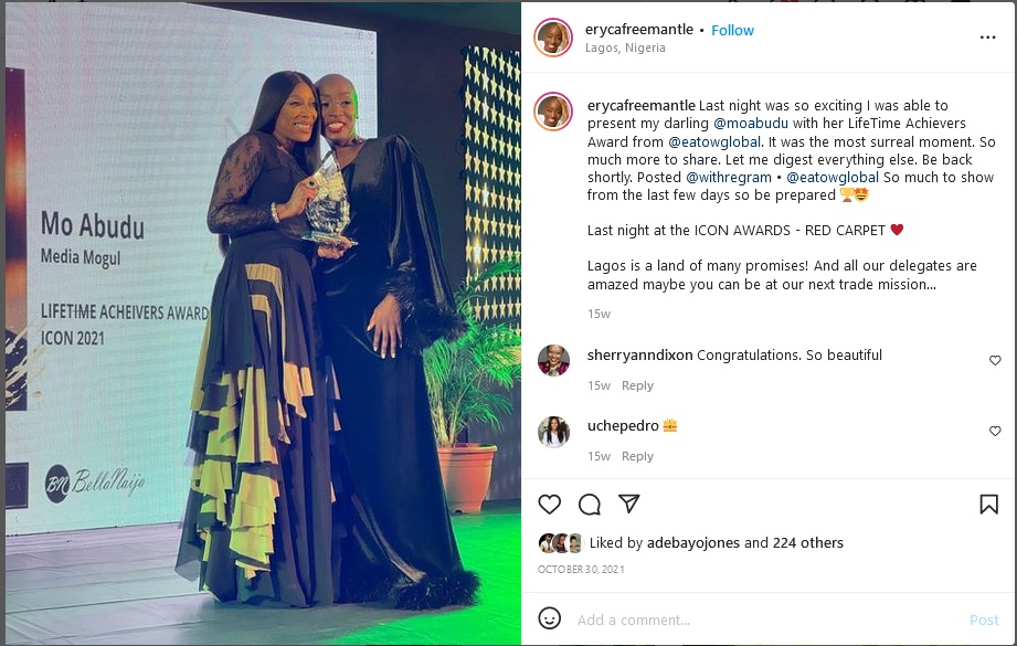 Mo Abudu …..”My darling Eryca Freemantle my sister and friend, love you so much. Thank you for always standing by me ❤️