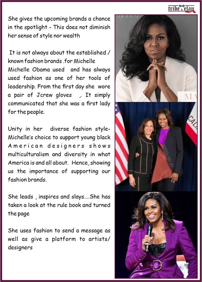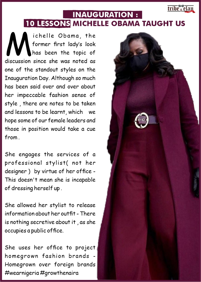 Michelle Obama, the former first lady’s look has been the topic of discussion since she was noted as one of the standout styles on the Inauguration Day. Although so much has been said over and over about her impeccable fashion sense of style , It’s the effortless flyness that keeps the conversations going . In the midst of it all , there are notes to be taken and lessons to be learnt, which we hope some of our female leaders and those in position would take a cue from .