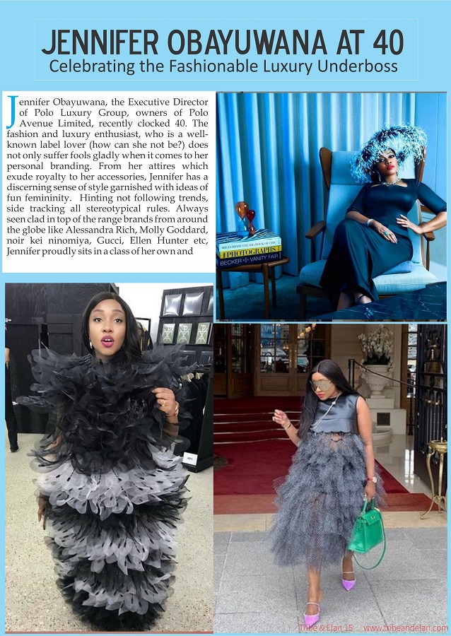 Jennifer Obayuwana , the Executive Director of Polo Luxury Group, owners of Polo Avenue Lmited , recently clocked 40 . The fashion and luxury enthusiast, who is a well-known label lover ( how can she not be? )does not only suffer fools gladly when it comes to her personal branding .