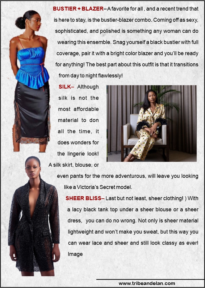 From Pepskru’s slip dresses to Banke kuku’s Pajama -inspired lounge wears , lingerie can be incorporated into everything from office wear to weekend happy hour appropriate!