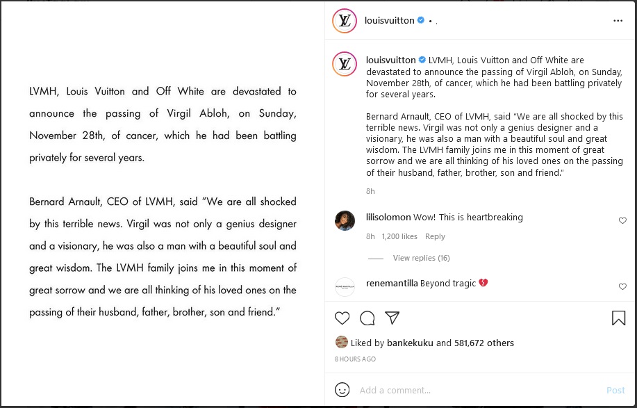 Louis Vuitton and the World Mourns Off – White Designer – Virgil Abloh as He Looses Battle with Cancer