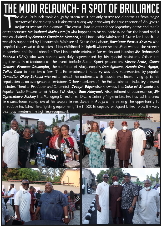 The Mudi Relaunch took Abuja by storm as it not only attracted dignitaries from major sectors of the society but it also went a long way in showing the true essence of Abuja as a major attractor for glamour. The event had in attendance legendary actor and media entrepreneuer Mr Richard Mofe Damijo who happens to be an iconic muse for the brand and it was co-chaired by Senator Onanimbe Mamora, the Honourable Minister of State for Health. He was ably supported by Honourable Minister of State for Labour, Barrister Festus Keyamu who regaled the crowd with stories of his childhood in Ughelli where he and Mudi walked the streets in careless childhood abandon. The Honourable minister for works and housing Mr Babatunde Fashola (SAN) who was absent was duly represented by his special assistant. Other top dignitaries in attendance at the event include Super Sport presenter Mozez Praiz, Osaro Onaiwo, Frances Okumagba, the publisher of Abuja enquiry Dan Agbawe, Azania Omo-Agege, Julius Rone to mention a few.