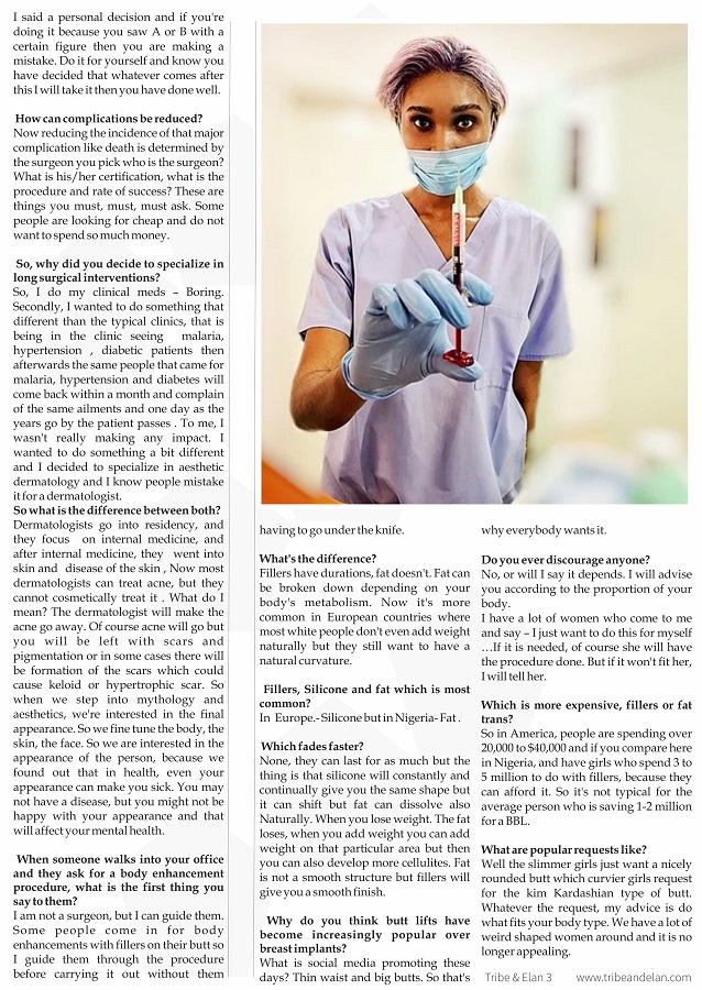 A- If you talk about the body, like things like surgical or non-surgical things. So for the surgical part., I always tell people, it doesn’t matter the surgery you do, be it cosmetic, be it gynecological , be it medical, whatever surgical procedure that is going to be done, the end result of complications most times is – Death . So when people say oh, I went for a cosmetic procedure and the person dies, they are only looking at the cosmetic part, they’re not realizing it’s a cosmetic surgery and therefore, as a surgery, the major complication of that surgery is death. But you cant say – Oh, she was sick. No, Rather you will hear – She didn’t like the way her body was and therefore she went to do something about it and in the process she died. That’s just the thing about it. It’s like I said a personal decision and if you’re doing it because you saw A or B with a certain figure then you are making a mistake. Do it for yourself and know you have decided that whatever comes after this I will take it then you have done well.
