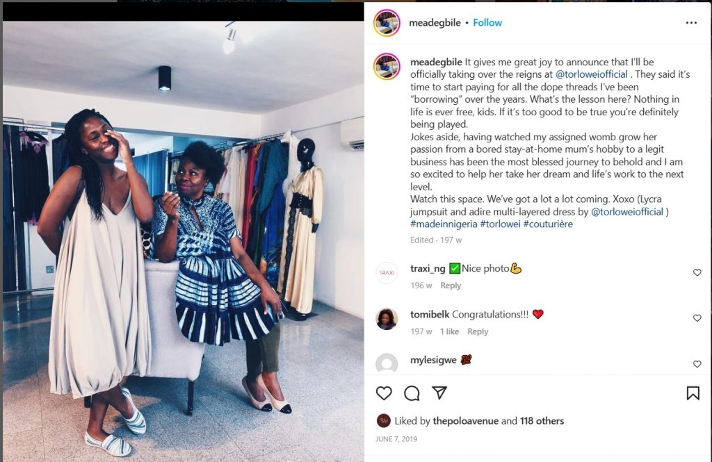 Today , the mother daughter duo have made Torlowei, an all-encompassing fashion house in Lagos, Nigeria, and Patience Please, Nigeria’s first registered lingerie manufacturers, has been featured in Legendary American Vogue Editor Andre Leon Talley’s fashion industry shaking memoir, The Chiffon Trenches. She is also the creator of the “Esther Dress”, the first piece of couture ever to join the Smithsonian Institution’s National Museum of African Art’s permanent collection.