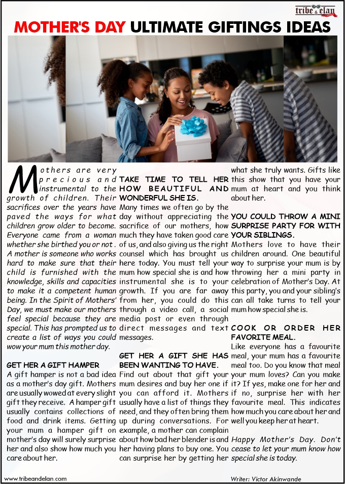 Mothers are very precious and instrumental to the growth of children. Their sacrifices over the years have paved the ways for what children grow older to become. Everyone has a mother in their life. A mother is someone who works hard to make sure that their child is furnished with the knowledge, skills and capacities to make it a competent human being. In the Spirit of Mothers’ Day, we must make our mothers feel special because they are special. This has prompted us to create a list of ways you could wow your mum this mother day.