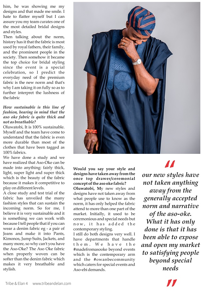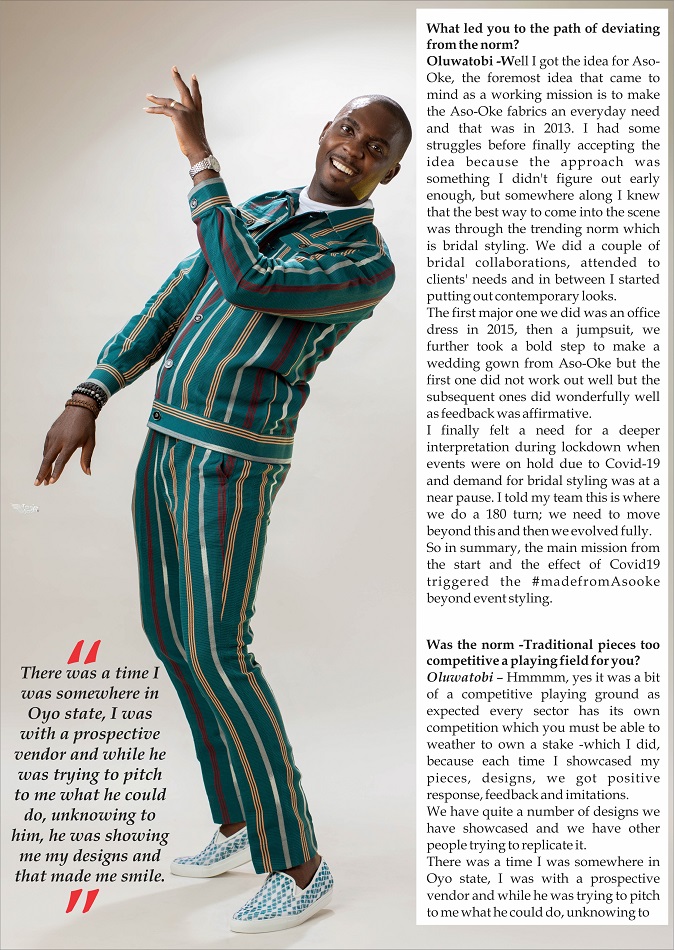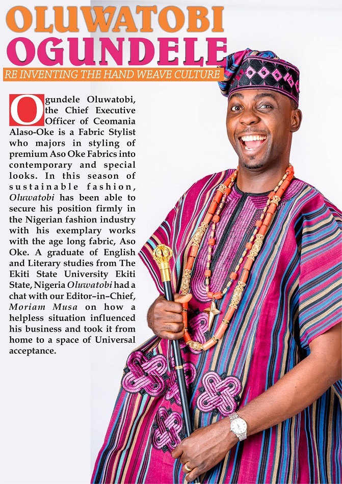 Ogundele Oluwatobi, the Ceo of Ceomania Alaso-Oke is a Fabric Stylist who majors in styling of premium Aso Oke Fabrics into contemporary and special looks. In this season of sustainable fashion , Oluwatobi has been able to secure his position firmly in the Nigerian fashion industry with his exemplary works with the age long fabric – Aso Oke . A graduate of English and Literary studies from The Ekiti State University Ekiti state, Nigeria Oluwatobi had a chat with our Editor – in – Chief – Moriam Musa on how a helpless situation influenced his business and took it from home to a space of Universal acceptance .