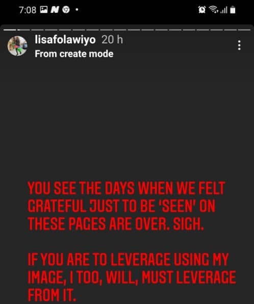 According to Lisa…..”You see the days when we felt grateful just to be “seen “on these pages are over .Sigh . If you are to leverage using my image, I too, will , must leverage from it ….”