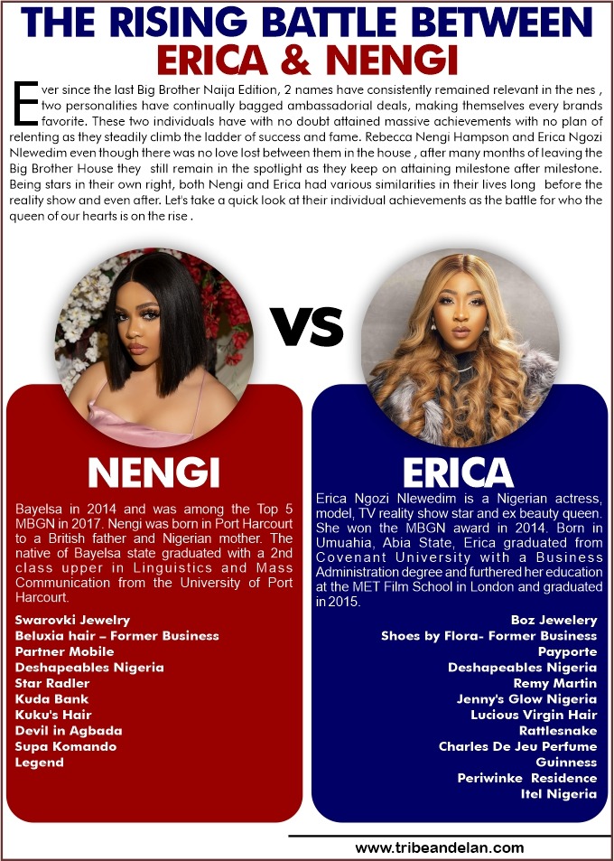 Ever since the last Big Brother Naija Edition, 2 names have consistently remained relevant in the minds of most fans , two personalities have continually bagged ambassadorial deals, making themselves every brands favorite. These two individuals have with no doubt attained massive achievements with no plan of relenting as they steadily climb the ladder of success and fame. Rebecca Nengi Hampson and Erica Ngozi Nlewedim even though there was no love lost between them in the house , after many months of leaving the Big Brother House they still remain in the spotlight as they keep on attaining milestone after milestone. Being stars in their own right, both Nengi and Erica had various similarities in their lives long before the reality show and even after. Let’s take a quick look at their individual achievements as the battle for who the queen of our hearts is on the rise .