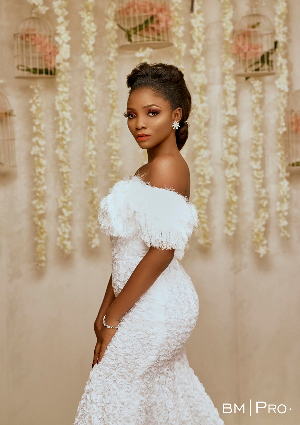 In one of the photos, Simi is styled in a white dress from Nonnistics new bridal line . The dreamy dress is an off shoulder tease with a feathered shoulder detail is every bride’s dream .