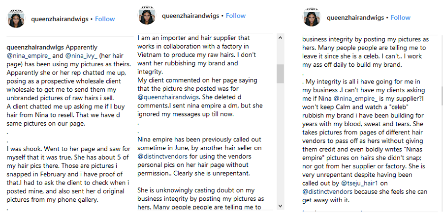 Ex BBnaija housemate Nina is definitely not having the best of her time right now just last week, news went round that she was being sued for non-appearance, though we have not heard of anything from her representatives, this is after she had tried to alter her picture o make herself look more curvy, now new allegations of stealing pictures off the internet and off other instagram hair vendors pages are rising again.