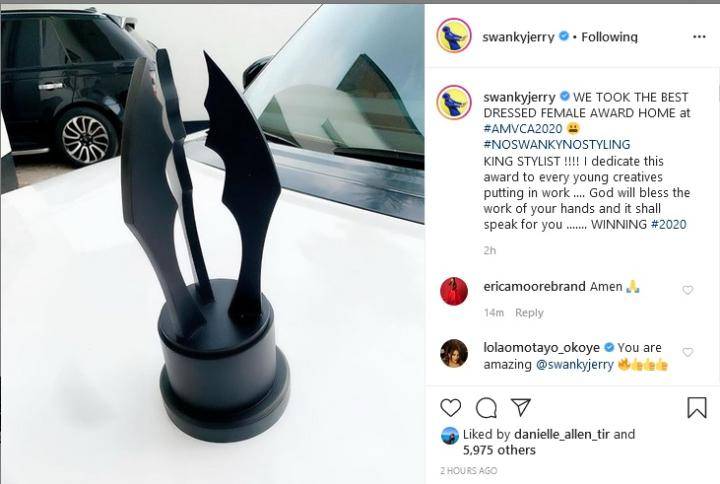 Social media is on fire with the ongoing battle between stylist – Swanky Jerry and his former boss – Toyin Lawani of Tiannah styling . Shortly after Mercy Eke ( ex big brother naija pepperdem housemate ) won te best dressed category, he took to his social medi page to celebrate his award by saying …..WE TOOK THE BEST DRESSED FEMALE AWARD HOME at #AMVCA2020 😬 #NOSWANKYNOSTYLING