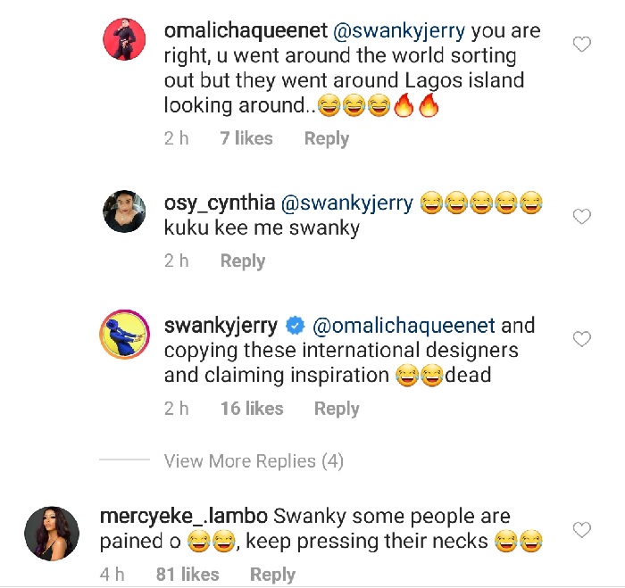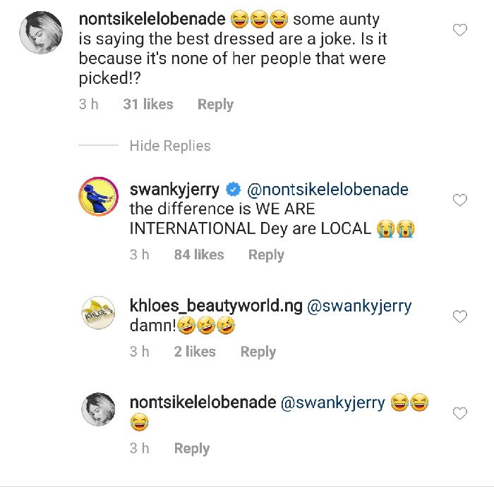 He did not stop there as a fan commented …Some Aunty is saying the best dressed are a joke . Is it becayse none of her people that were picked? to which Swanky replied ….the difference is that WE ARE INTERNTIONAL . Dey are LOCAL….