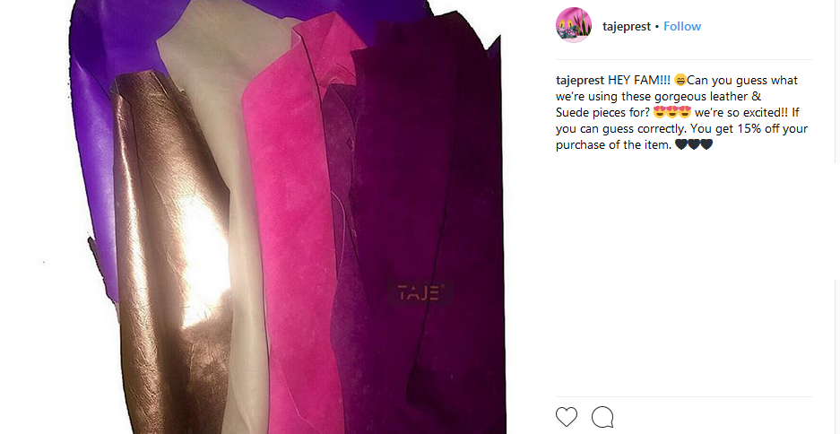 Though we hear her new designs are handbags, as a shoot has already taken place for the new handbags, Tajé has not officially announced what her new pieces are, we are eagerly waiting.