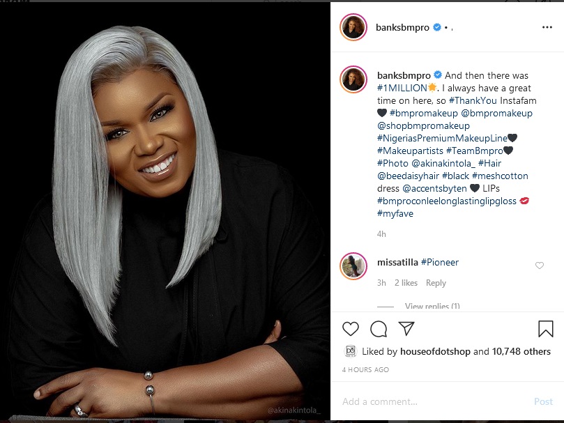 Nigerian’s legendary make up artist – Banke Meshida Lawal recently hit 1 million followers on instagram. This will be the first time in the Nigerian make up industry that a home based and home grown makeup artist  would be hitting such numbers organically . The Banke Meshida Lawal page – Bankebmpro first stated out on instagram on the 22nd March 2012 and it has taken approximatey 8 years to achieve this historical fete . Her first post had just 57 likes and 4 comments . Today a single post from Banke attracts over thousands of likes and hundreds of comments .