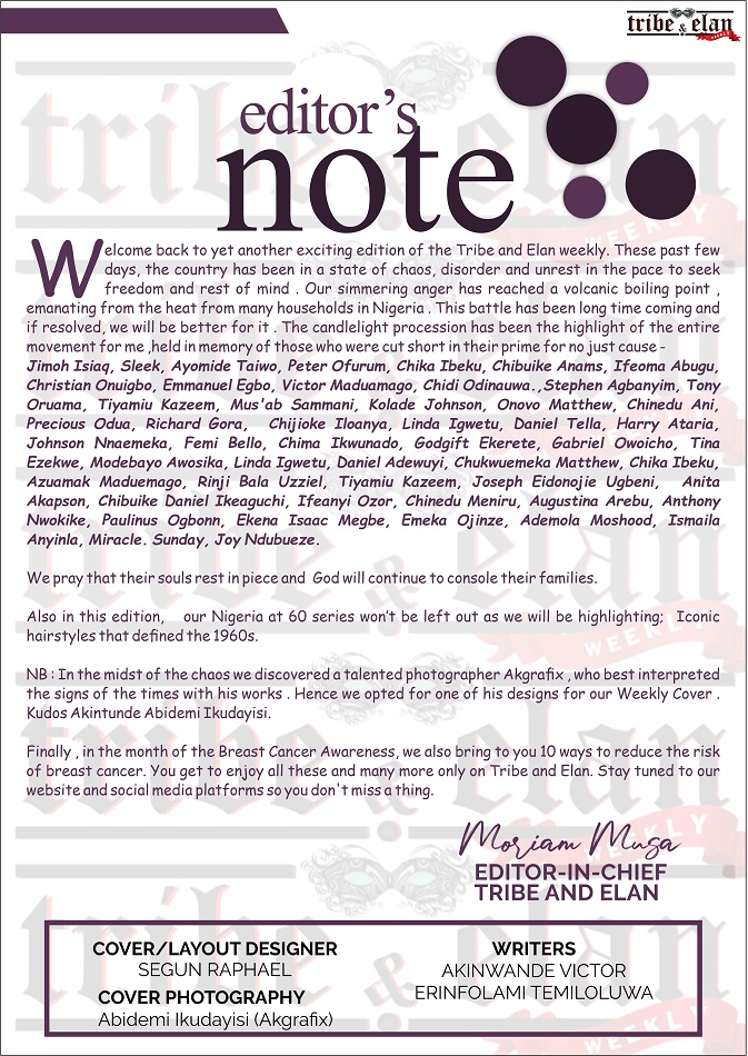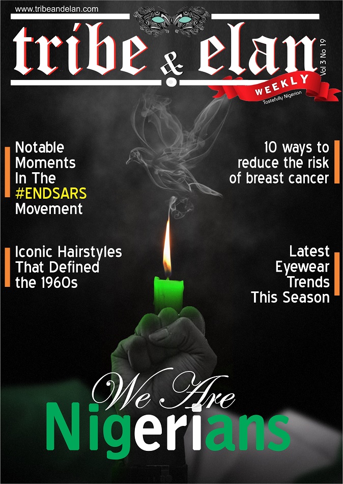 Welcome back to yet another exciting edition of the Tribe and Elan weekly. These past few days, the country has been in a state of chaos, disorder and unrest in the pace to seek freedom and rest of mind . Our simmering anger has reached a volcanic boiling point , emanating from the heat from many households in Nigeria . This battle has been long time coming and if resolved, we will be better for it .
