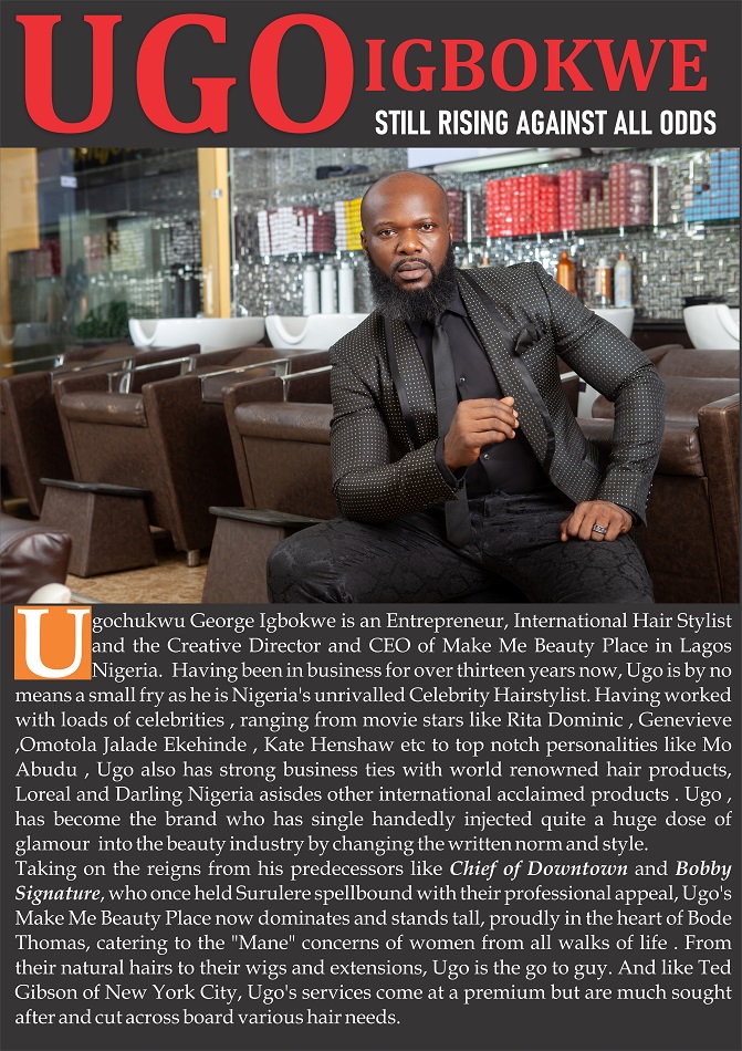 Ugochukwu George Igbokwe is an Entrepreneur, International Hair Stylist and the Creative Director and CEO of Make Me Beauty Place in Lagos Nigeria. Having been in business for over thirteen years now, Ugo is by no means a small fry as he is Nigeria’s unrivalled Celebrity Hairstylist . Having worked with loads of celebrities , ranging from movie stars like Rita Dominic , Genevieve ,Omotola Jalade Ekehinde , Kate Henshaw etc to top notch personalities like Mo Abudu , Ugo also has strong business ties with world renowned hair products – Loreal and Darling Nigeria asisdes other international acclaimed products . Ugo , has become the brand who has single handedly injected quite a huge dose of glamour into the beauty industry by changing the written norm and style .
