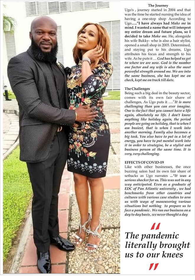 Ugo’s , journey started in 2004 and that was the time he started nursing the idea of having a one-stop shop According to Ugo…..”I have always had Make me in mind. I wanted a name that will interpret my entire dream and future plans, so I decided to take Make me….. He , alongside his wife Bukky- who is also a hair stylist, opened a small shop in 2003. Determined, and staying put to his dreams, Ugo attributes his focus and strength to his wife. As he puts it …. God has helped us get to where we are now. God is the number one factor and my wife is also the most powerful strength around me. We are into the same business, she has kept me on check, kept me on track till date.