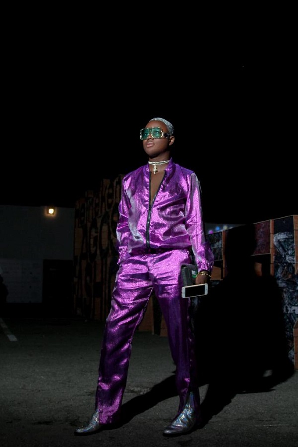 I got to the venue pretty late, 7pm or there about. The street style was pretty much dead, but then I got in and revived it. okurrr! I felt like KKW, literally everyone was taking pictures of me, pictures with me, and i did tons on interviews. And about my outfit, I was wearing a two piece look from my self named brand FOLA FRANCIS, a pair of boots from KIING DAVIIDS, and FENTY’s Blockt mask, but the star of the show was my glittery head.