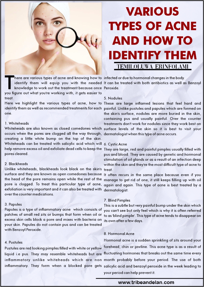 There are various types of acne and knowing how to identify them will equip you with the needed knowledge to work out the treatment because once you figure out what you’re working with, it gets easier to treat.