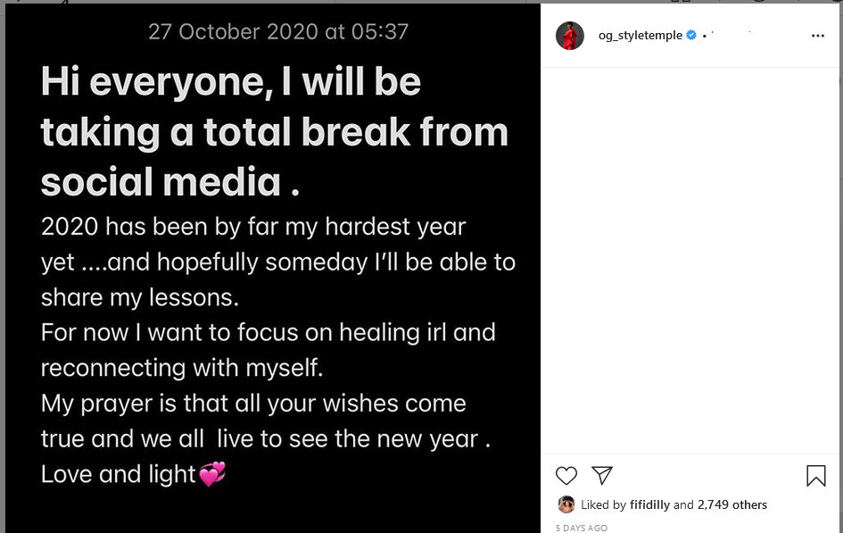 OG Okonkwo, fashion designer and the brain behind Style Temple has announced on Instagram that she would be taking a break off social media to heal. According to her, 2020 has been the hardest year for her. We hope she is fine and we pray for a quick recovery for her,