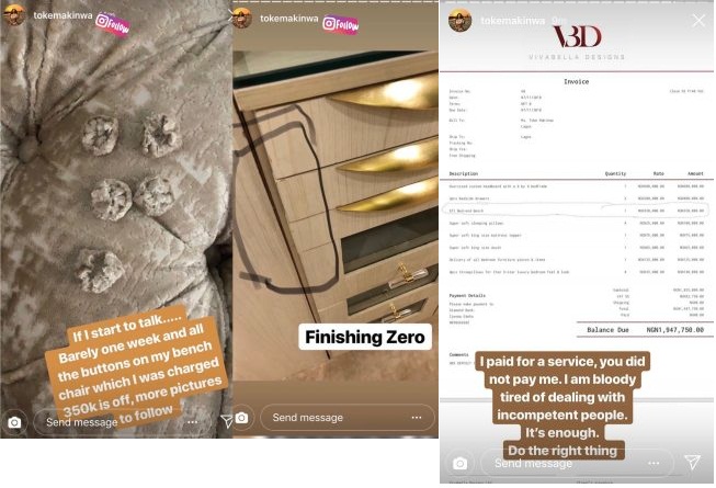 Toke via a deleted Insta-story, buttressed her allegations by sharing photos of soe of the already deteriorating furniture alongside a copy of her receipt for payment to Sandra Edoho who in time past handled the interior decoration for Toke’s former Lekki home, thus earning her a consideration for the decoration of her new home.