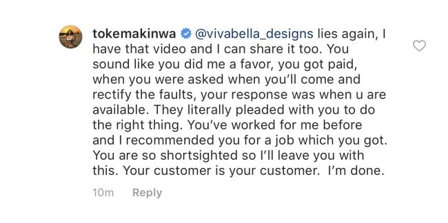 “I paid for a service and I have a right to complain. My blind is still bad, the top of my closet island is bad and when you were asked, you said nature is responsible for that. You blamed the machine for the bad finishing on the wood too. Pls do the right thing,” Toke wrote.